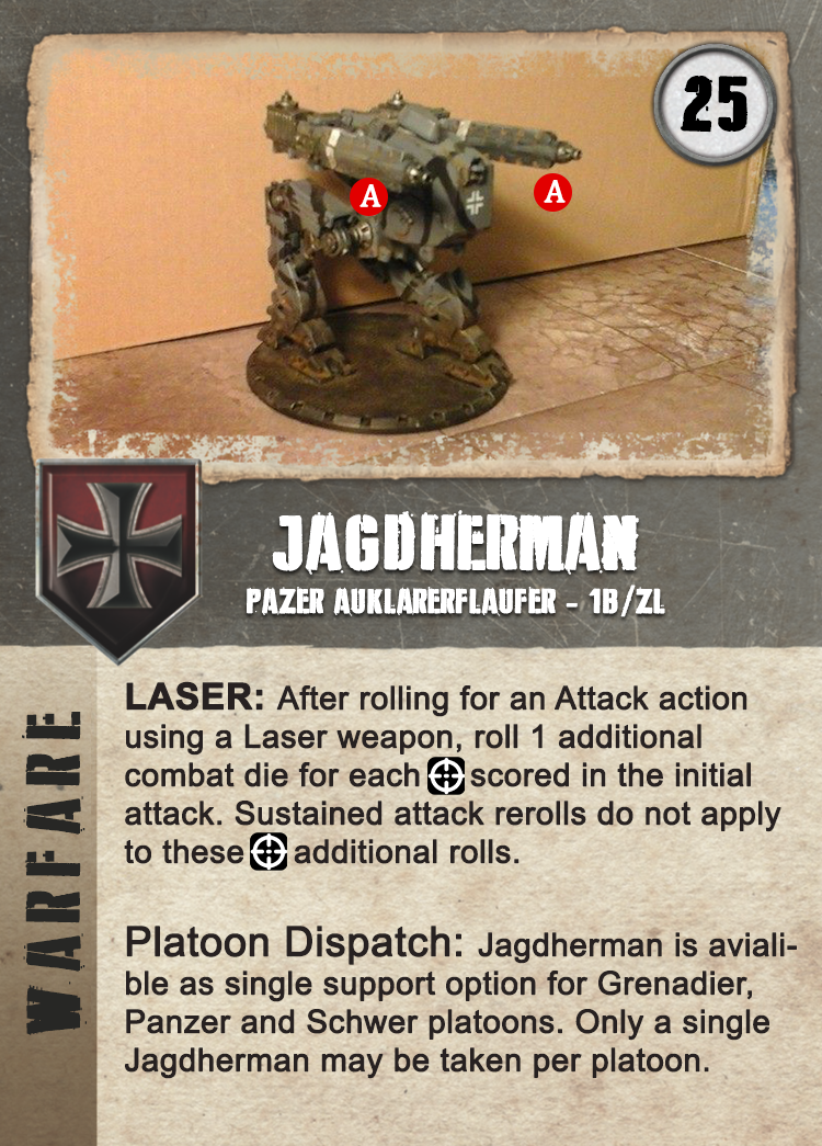 Jagdherman is available as single support option for Grenadier, Panzer and Schwer platoons. Only a single Jagdherman may be taken per platoon.
